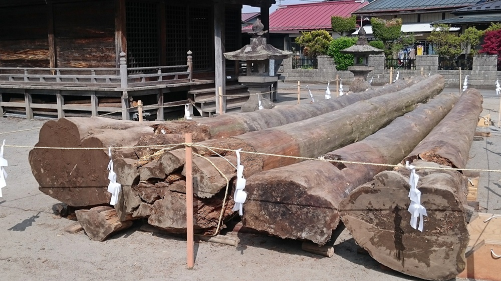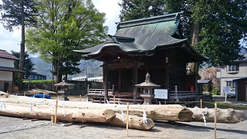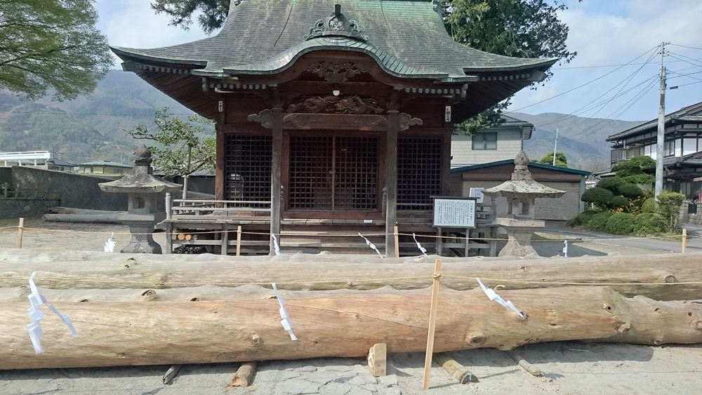 八龍社の社前に本宮の四本の古御柱が並ぶ光景は、まさに壮観である。