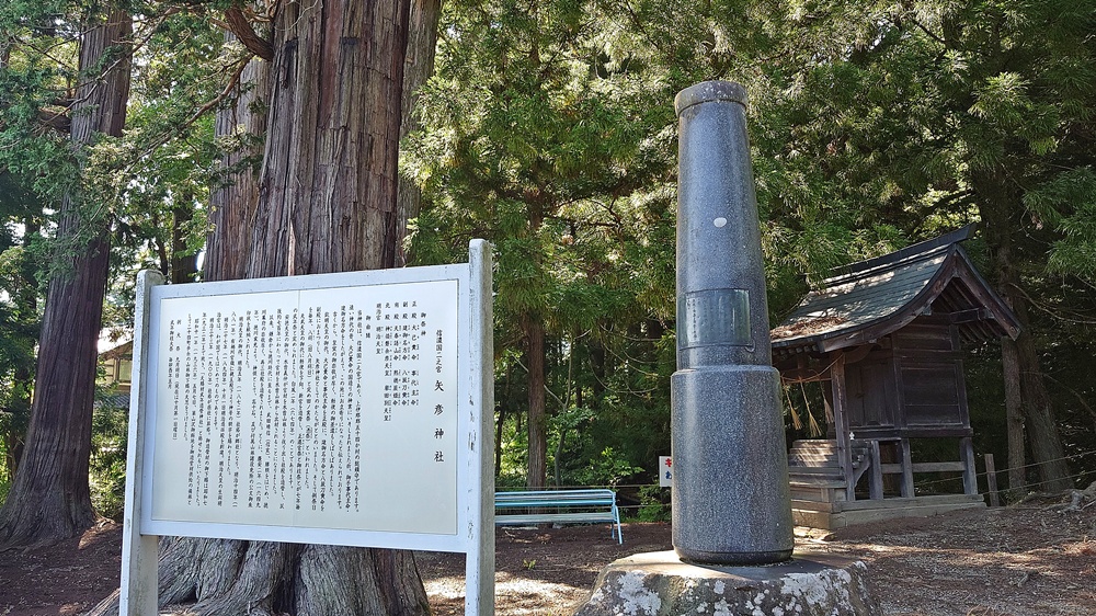 小野神社と矢彦神社は同じ境内に並んでいるように見えるが、小野神社は塩尻市、矢彦神社は上伊那郡辰野町になる。