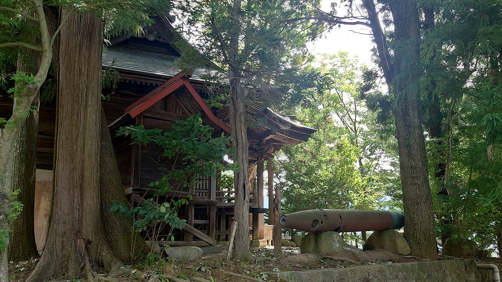 神社の境内に魚雷が鎮座するという、全国的にも珍しい光景である。